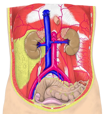 現在は腹大動脈 (abdominal aorta) の項を作成しているので、下は腹大動脈を中心に描いたイラストとなる。何もない真っ白な状態から下のイラストが完成するまでに、最低でも3日間はかかってしまう。
