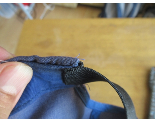 まず、木工用の接着剤 (adhesive/glue) を用いて帽子とゴムバンドを仮留めした。乾くと帽子本体とゴムバンドはけっこう強力に接着しているので、一瞬「 ん、もしかしたら縫う (sew) 必要はないかな?」とも思ったが、長期の使用を考えるとやはり縫うのが一番である。