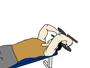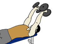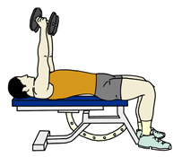 ・息を吸いながら、肘を曲げてダンベルを下ろしていく。(正確にはこの状態がスタートとなる) (勢いよく下ろさずに、なるべくダンベルの重さに抵抗するように下ろすこと) ・この時、二の腕はフロアに対して垂直となっている。 ・そして、息を吐きながら肘を伸ばしダンベルを上げていく。 ・この時、なるべく肘はスタートの位置を保ち、動かさない。 ・目標回数:10回から15回を1セットとし、2セットから3セットが目標セット数 |