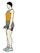 ・それぞれの手にダンベルを持ち、フロアに立つ。 ・足幅は動作がしやすい幅を取る。ぴったりくっつけるよりは、腰幅程度に開いて いた方が動作はしやすいと思われる。 |