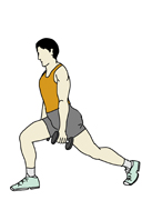 ・片足を一歩大きく後ろのフロアに踏み込む。フロントランジとは違って、かかとは浮かせた形になる。 ・この時、背筋はまっすぐに伸ばし、上半身はフロアに対して垂直にする。 ・膝は、後ろに踏み込んだ衝撃を吸収するために、曲げた形でフロアに足をつける。 |