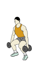 ・それぞれの手にダンベルを持ち、フロアに立つ。 ・膝はピンとロックさせずに気持ち曲げ、足幅は腰幅から肩幅程度に広げる。 (狭くするナロウや広く取るワイドなどもある) |