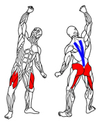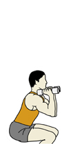 ・上半身を前傾させながら腰を落とし、そして、息を吐きながら再び腰を上げていく。 ・呼吸は、腰を落とす時に吸い、上げるときに吐く。 ・腰を落としたときに、なるべく膝がつま先から前に出ないようにする。 (膝がつま先より前に出てしまうと、膝を痛める原因になる) ・視線は、正面または離れた前方のフロアに落とし、背筋は必ずまっすぐに保つ。 (視線を下に落としてしまうと、背筋が丸まる原因になる) ・基本的には、腰を落とす時も上げる時も同じカウントで行い、なるべく反動はつけないようにする。 目標回数:10回から15回を1セットとし、2セットから3セットを目標とする。 |