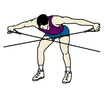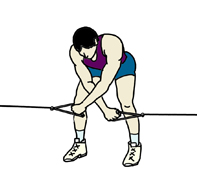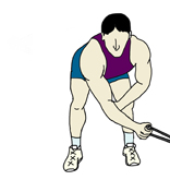 ・動作する手でハンドルを握り、上半身を前傾させる。 (どこまで倒さなければいけないというものではないが、前傾が強ければ強いほど、背中の筋肉群に強い刺激を与えることができる。ただし、初心者にはやりづらい部分も出てくるので、少しずつ傾斜の度合いを高めていくとよい) ・動作をしない方の手は任意の位置で構わないが、イラストのように、膝上あたりに添えておくと姿勢が取りやすいと思われる。 ・背筋はまっすぐに保ち、膝は曲げておく。足幅は動作しやすい幅を取る。 ・視線は真下に向けると背中が曲がりやすくなるので、まっすぐ前方に向けるか、離れた前方のフロアに落とす。 |