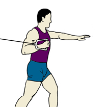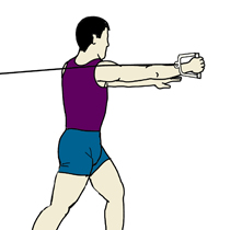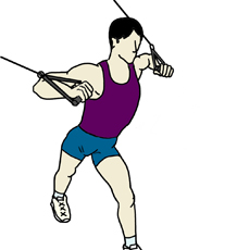 ・マシーンを背にし両足を前後に広げてフロアに立ち、片手でケーブルを握っていく。 ・動作をしないもう一方の手は任意の位置で構わないが、イラストのように前に伸ばした方が、バランスが取りやすいと思われる。 |