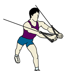 ・息を吐きながら、ハンドルを握った手を前に伸ばしていく。 ・このとき、なるべく上半身は前後にスイングさせずに固定しておく。 ・戻す時も勢いよく戻さずに、なるべくウエイトの重さに抵抗するように胸を開いていく。 ・目標回数:10回から15回を1セットとし、2セットから3セットが目標セット数 |