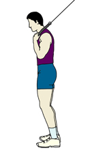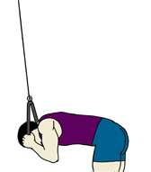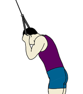 ・マシーンに向かって立ち(または膝まづき)、それぞれの手でトライセプスロープを握っていく。 ・このとき、足は動作しやすい幅(目安として腰幅程度)に開き、膝は気持ち曲げておく。 |
