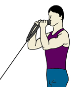 ・それぞれの手でトライセプスロープの端を握って、フロアに立つ。 ・背筋はまっすぐに伸ばし、足は前後、または動作しやすい幅で左右に開く。 ・肘は、脇か、またはイラストのように気持ち体の前に出して固定する。 |