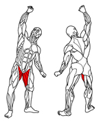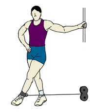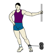 ・息を吐きながら膝はなるべく曲げないで、アンクルストラップを巻きつけた足を、もう一方の足と交差するように内側にスイングさせていく。 ・このとき、上半身は元の状態を保ち動かさない。 ・戻す時は、勢いをつけて戻さずに、なるべくウエイトの重さに抵抗するようにして戻していく。 ・目標回数:10回から15回を1セットとして、2セットから3セットが目標セット数 |