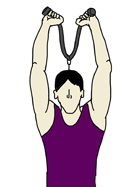・息を吐きながら肘を伸ばして、グリップを握ったコブシを上げていく。 ・このとき、肘はなるべく動かさないで最初の位置を保つ。また、背筋もまっすぐに保って、上半身が前後に振られないようにする。 ・下ろす時も、勢いよく下ろさずに、なるべくウエイトの重さに抵抗するように下ろすこと。 ・目標回数:片腕、10回前後を1セットとし、2セットから3セットが目標セット数 |