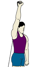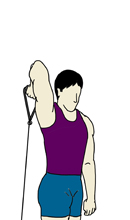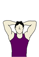 ・片手でグリップを握り、マシーンを背にして足を動作しやすい幅に開いて(前後に開いても良い)、肘がフロアに対して垂直になるよにまっすぐ上げて構える。 ・この時、背筋はまっすぐに伸ばし、フロアに対して垂直に保つ。またイラストでは、もう一方の手は下へ下げているが、ハンドルを握った手の二の腕あたりに当ててサポートしてやってもよい。 ・視線は、真下に向けると背中が丸くなりやすくなるので、正面または少し離れたフロアに落とす。 |