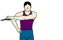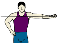 ・片手でグリップを握り、プーリー(ケーブルが出てくる滑車)が横になるように体の向きを変え、動作しやすい足幅を取って構える。 ・このときプーリーの高さが、だいたい肩の高さになるように調節する。 ・ハンドルを握らないもう一方の手は、動作しやすい任意の位置で構わない。イラストでは、一例として腰に置いてある。 ・背筋はまっすぐ伸ばし、上半身はフロアに対して垂直に保ち、肘は気持ち曲げ置く。 ・使用するアタッチメントは、金属製でないものの方が柔軟性があって動作しやすいと思われるので(個人差あり)、ストラップハンドルやトライセプスシングルロープがよい。 |