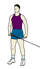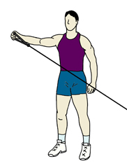 ・息を吐きながら、ケーブルを握ったコブシを横に上げていく。 ・コブシは、真横ではなく気持ち斜め横に上げ、肘は最初の角度を保つ。 ・上げる高さで運動強度の調節ができる。上げれば上げるほど運動強度は上がるが、腕がフロアと平行か、気持ちそれよりも高くなるように上げるのが一つの目安となる。 ・戻す時も勢いよく戻さずに、なるべくウエイトの重さに抵抗するように戻すこと。 ・目標回数:10回から15回を1セットとし、2セットから3セットが目標セット数 |