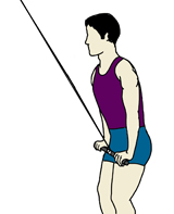・息を吐きながら、バーを太ももに着けるように腕を引き下ろしていく。 ・肘の角度は変えず、動作中は上半身は固定して動かさない。 ・戻す時は勢いをつけて戻さずに、なるべくウエイトの重さに抵抗するようにして戻していく。 ・目標回数:10回から15回を1セットとして、2セットから3セットが目標セット数 |