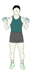 ・足を腰幅程度に開き、ペットボトルを肩の高さに持ってきて構える。 |