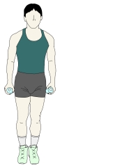 ・フロントレイズをしながら、どちらか一方の足を横に出し腰を落としていく。 ・このとき、背筋はまっすぐに保ち、横にステップした足の膝はつま先よりも前に出ないようにしていく。また、伸ばした足の膝は、なるべくまっすぐになるようにする。 ・横にステップした足の底でフロアを踏み込むようにしてスタートポジションに戻していく。 ・同じ側を繰り返してもよいし、左右交互に行っても構わない。 |