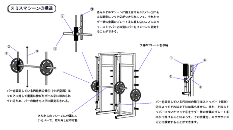 スミスマシーンの語源についてインターネットで調べてみたのですが、はっきりしません。まあ、人の名前 からきているのは容易に想像はできますが…。 フリーウエイトのトレーニングができるフィットネスクラブであれば、ほとんどのところで見かけるマシーン ではないでしょうか。 ウエイトを差し込むバーの軌道が固定(上下)されているので、重いウエイトをつけてトレーニングをしても 前後左右に身体が振られることありません。 また、バーの下がる位置を調節することができるので、より安全に行うことができます。そのため、「つぶれるまで追い込みたい」という人やウエイトトレーニング初心者にはお勧めのマシーンです。 軌道が固定されていてより安全に使える半面、バーが上下にしか動きませんので、行えるエクササイズの種類 は限られます。ですから、ベテランの人の中には「あまり好きではない!」という人もいるかもしれません。