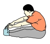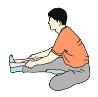 ・イラストは片足のストレッチだが、場合によっては両足一緒に行うことも可能。上半身をフロアに近づければ近づけるほど強度は上がっていく。 ・膝に負担がかかることもあるので注意したい。 |
