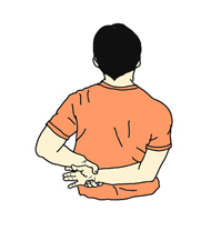 ・片腕(又は両腕)を背部に回して引く形。僧帽筋の上部と三角筋の中央部をストレッチすることができる。 ・左のイラストのようにもう一方の手で引き、さらに頭を引いている手の方に倒すと、よりストレッチ効果は高まる。 ・また、右のイラストのようにイスに座って行う場合は、背もたれの縁などに手をかけてストレッチ効果を高めることもできる。 |