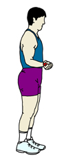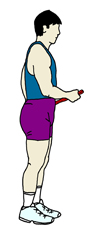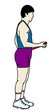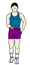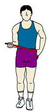 肘の角度、位置を変えずにこぶしを外側に回旋させていく。 このとき、体はしっかりと正面を向けておく。 戻すときも、勢いをつけずにチューブの弾性を感じながらスタートの位置に戻すこと。 (回数)1セットを10回から15回とし、1セットから3セットを目標とするようにする。 |