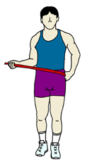 回旋を行う手の肘を約90度に曲げ、脇にしっかりと固定し、手の甲をフロアに向けチューブを握る。 もう一方の手でチューブの別の端を握り、腰に押しつけて固定する。 |