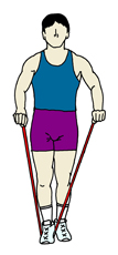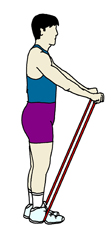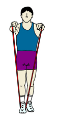 息を吐きながら、肘はピンと張らずに気持ち曲げ、こぶしが肩の高さになるくらいまで上げていく。 このとき、なるべく勢いをつけないで上げていく。また、体は常にフロアに対して垂直に保つ。 力みすぎて肩まで上げない(=耳の方に近づけない)ようにする。 下げるときも、勢いをつけずにチューブの弾性を感じながらスタートの位置に戻すこと。 (回数)1セットを10回から15回とし、1セットから3セットを目標とするようにする。 |