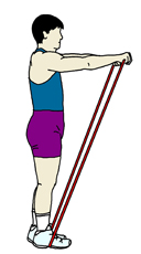 ダンベルなどを使って行われたりすることもありますが、チューブエクササイズの代表的な動作の一つです。 特に三角筋の前部(正面に面した部分)を鍛えるのに適したエクササイズです。 |
