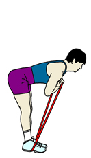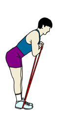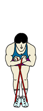動作としてはかなりマイナーなものだと思われます。正直言うと、やっている人を見たことがありません。フリーウエイトなどで重い負荷をかける場合はかなり注意が必要だと思いますが、チューブあたりであれば負荷が強すぎてけがをする可能性はかなり低いとは思いますが、腰痛がある人は要注意です。 また、ハムストリングスの柔軟性がない人は、膝を伸ばしたまま上半身を倒していくのは辛い場合もありますので、その時は膝を曲げて調節してください。 なお、下の解説ですが、本来ならイラストの「3」がスタートの位置になると思いますが、「3」の姿勢からチューブを握っていくのはやりづらい部分もありますので、立った状態からチューブを握ってみました。その場合、立ってチューブを握った時点でかなりチューブの張りを感じないと、チューブを用いる意味がなくなってしまいますので、注意してください。 |