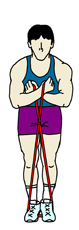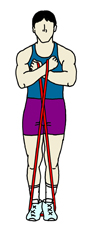 両足でチューブを踏み、胸の前でクロスするようにそれぞれの手でチューブを握っていく。 この時点で、「張り(引き戻される力)」を感じるくらいまでチューブが伸びていないと、チューブを使用する意味がなくなってしまうので注意する。また、チューブの持ち方は一様ではなく、胸の前でクロスさせないもの、チューブの長さによっては、手をフロアに向けて伸ばして引くやり方もあり、各人がやりやすい方法を選ぶこと。 |