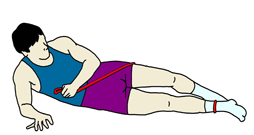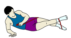 《フロアに横になり、上げる足の足首にチューブをかけて》