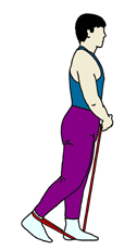 伸ばす足の足首あたりにチューブをかけ、軸足でチューブを踏んでいく。 伸ばす足は気持ち膝を曲げておく。(伸ばしきってしまうと可動域がかなり狭くなってしまうので、多少曲げておいた方が全体的な動作はやりやすいと思われる) |