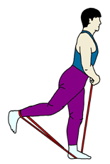 なるべく上半身は前傾させないようにして、チューブをかけた足を後ろに伸ばしていく。 全く上半身を前傾させずスタートのままで固定してしまっては、全体的な運動の可動域がかなり狭くなってしまうので、多少上半身が前傾してしまうのは許容範囲) 戻すときも、勢いをつけずにチューブの弾性を感じながらスタートの位置に戻すこと。 (回数)1セットを10回から15回とし、1セットから3セットを目標とするようにする。 |