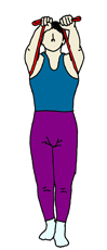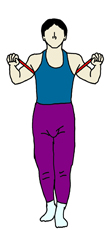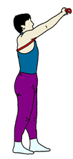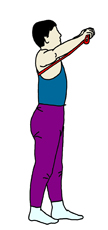 息を吐きながらこぶし同士をくっつけるようにして、腕を斜め上方に伸ばしていく。 背筋はまっすぐに保ち、体全体もフロアに対して垂直にする。 戻すときも、勢いをつけずにチューブの弾性を感じながらスタートの位置に戻すこと。 (回数)1セットを10回から15回とし、1セットから3セットを目標とするようにする。 |
