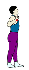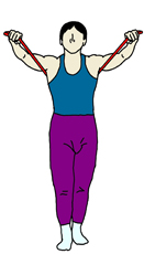 脇の下に来るくらいにチューブを背中から回し、その端をそれぞれの手で握る。 視線は腕を伸ばしたときにこぶしの位置が来る斜め上方に向けておく。 |