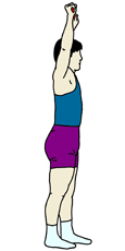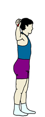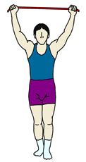 それぞれの手でチューブを握り、頭上で構える。 背筋はまっすぐにし、気持ち肘は曲げておく。 |