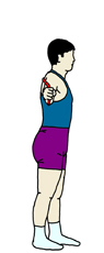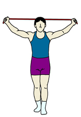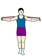 息を吐き、上の状態(背筋はまっすぐ、気持ち肘は曲げておく)を保ちながら、こぶしを左右に開き、チューブが肩に触れるまで下ろしてくる。 戻すときも、勢いをつけずにチューブの弾性を感じながらスタートの位置に戻すこと。 (回数)1セットを10回から15回とし、1セットから3セットを目標とするようにする。 |