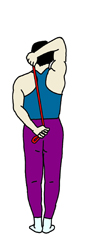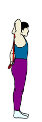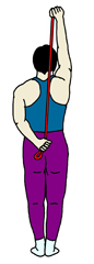 背なかでそれぞれの手でチューブを握っていく。 このとき、上に来る手(プレスをする方)の二の腕が、だいたいフロアに対して垂直になるようにする。チューブの長さや下の手の位置を変えて運動強度を調節する。 |