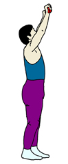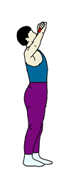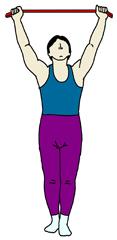 それぞれの手でチューブを握り、頭上で構える。 背筋はまっすぐにし、気持ち肘は曲げておく。このとき、視線はチューブに向けておく。 |