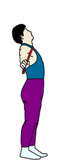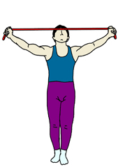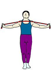 息を吐き、ほんのわずかではあるが、上半身を後へ反らせながら、チューブを鎖骨に押しつけるように下ろしてくる。 戻すときも、勢いをつけずにチューブの弾性を感じながらスタートの位置に戻すこと。 (回数)1セットを10回から15回とし、1セットから3セットを目標とするようにする。 |