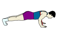 息を吸いながら、体を一直線に保ったまま肘を曲げ胸をフロアに近づけていく。どこまでフロアに近づけるかで強度の調節ができる。そして、息を吐きながら肘を伸ばし、スタートの位置まで体を上げていく。基本的には、「下げる・上げる」は同じカウントで行う。 (回数)1セットを10回から15回とし、1セットから3セットを目標とするようにする。 |