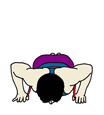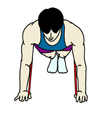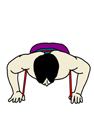 チューブを背中から回し、その端をそれぞれの手で握り準備をする。 横から見た時に、手の付け根(母指球、小指球)がだいたい肩の下に来るようにし、頭からかかとまで一直線にする。手の幅は肩幅かそれよりも広く取る。手の指はまっすぐ前に向ける。 |