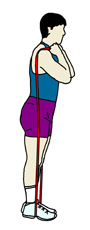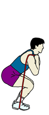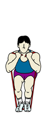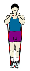 両足でチューブを踏んで、その端を、肩の後ろから回して、それぞれの手で握る。両足の間隔は、上のイラストではほとんど開けていないが、右のイラストのようにいろいろと可能。 |