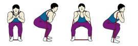 息を吸いながら、背筋をしっかりと伸ばしたまま、腰を落としていく。そして、息を吐きながら、腰をスタートの位置まで上げていく。視線は真下でなく、斜め前方のフロアか前方に向ける。 どこまで落とすかで強度の調節が可能。可能であれば、太ももがフロアと平行になるようにする。また、横から見た時に、なるべく膝はつま先から出ないようにする。 (回数)1セットを10回から15回とし、1セットから3セットを目標とするようにする。 |