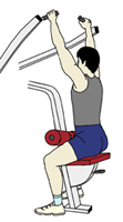 ・座席の高さや太ももを固定するパッドは高さの調節が可能なので、できれば手を上に伸ばしたときでも、ウエイトの負荷がかかるような高さでポジションを決めていく。 ・背筋はまっすぐに伸ばし、グリップはそれほど意識的に強く握る必要はない。場合によっては、親指をかけないサムレスでも構わない。 |