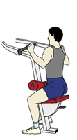 ・息を吐きながら、両肘を自分の脇の方に引き下ろしていく。 ・このとき、背筋はまっすぐに保ち、なるべく上半身は動かさずに固定する。 ・戻す時も勢いよく戻さずに、なるべくウエイトの重さに抵抗するようにして戻していく。 ・目標回数:10回から15回を1セットとして、2セットから3セットを目標とする。 |