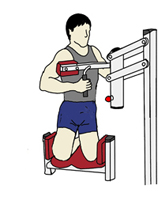・胸に当てるパッドの高さの調節は可能なので、しっかりと体が安定するところにセットし、それぞれの手でハンドルを持って上半身を固定する。 |