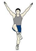 | 「ダブルニーアップ(フロントクロス)」はいわゆる「ダブルニーアップの変形」で、ダブルニーアップをアレンジしたものになります。 「ダブルニーアップ」が上下のニーアップに対して「フロントクロス」は、その名のごとく、ニーアップした足と軸足をクロスさせたものです。「ダブルニーアップ」に比べると、上半身が振られやすいのでしっかりとコントロールしたいものです。 また、ここでは一番よく見られるパターンとして、両手を斜め上に伸ばしていますが、指先までまっすぐに伸ばせるときれいに見えます。 |