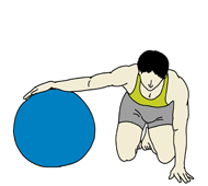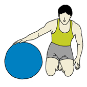 (右肩をストレッチする場合) フロアに膝まづき、右横にボールを置く。 |