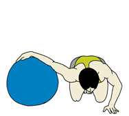 痛みを覚える手前で止め、15秒から30秒(目安)ほどかけてゆっくりとストレッチをする。ボールを気持ち前後へローリングさせてることによって伸びる場所も変わるし、同じ場所でも、少しずつ上半身をフロアへ沈める度合いを深めてやってもよい。 |