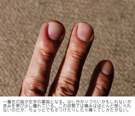 何もしない分には特に痛みも感じられないのだが、指だけにあっちこっちにぶつけ、そのたびに不快な思いをさせられる。そして、ぶつけた後は赤みや腫れも増す。やれやれ、完治するまでにはしばらく時間がかかりそうだ。